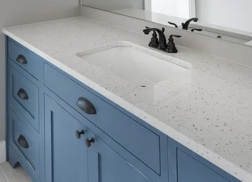 Description: Iced White quartz is gorgeous with shades of white and gray. This color combination is so elegant that you can't help but fall in love with it. Stain-resistant, durable, and low-maintenance qualities of this stone make it ideal for both commercial and home spaces. It comes in prefabricated options for flexible designs and installation. This stone may be in trend, but it is a choice that is designed to be loved through various generations.