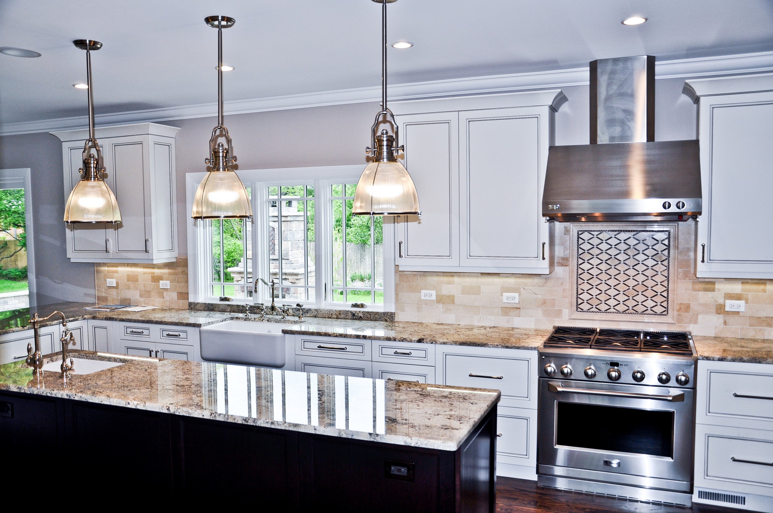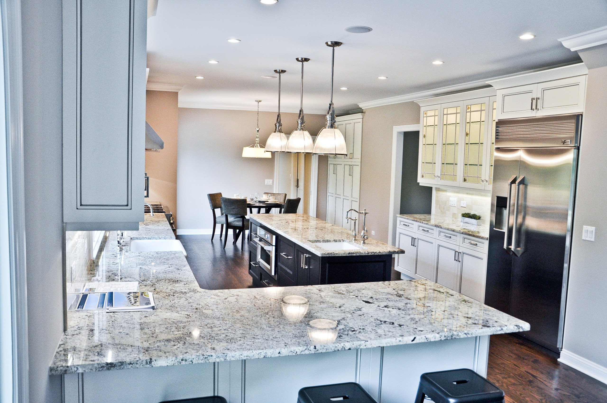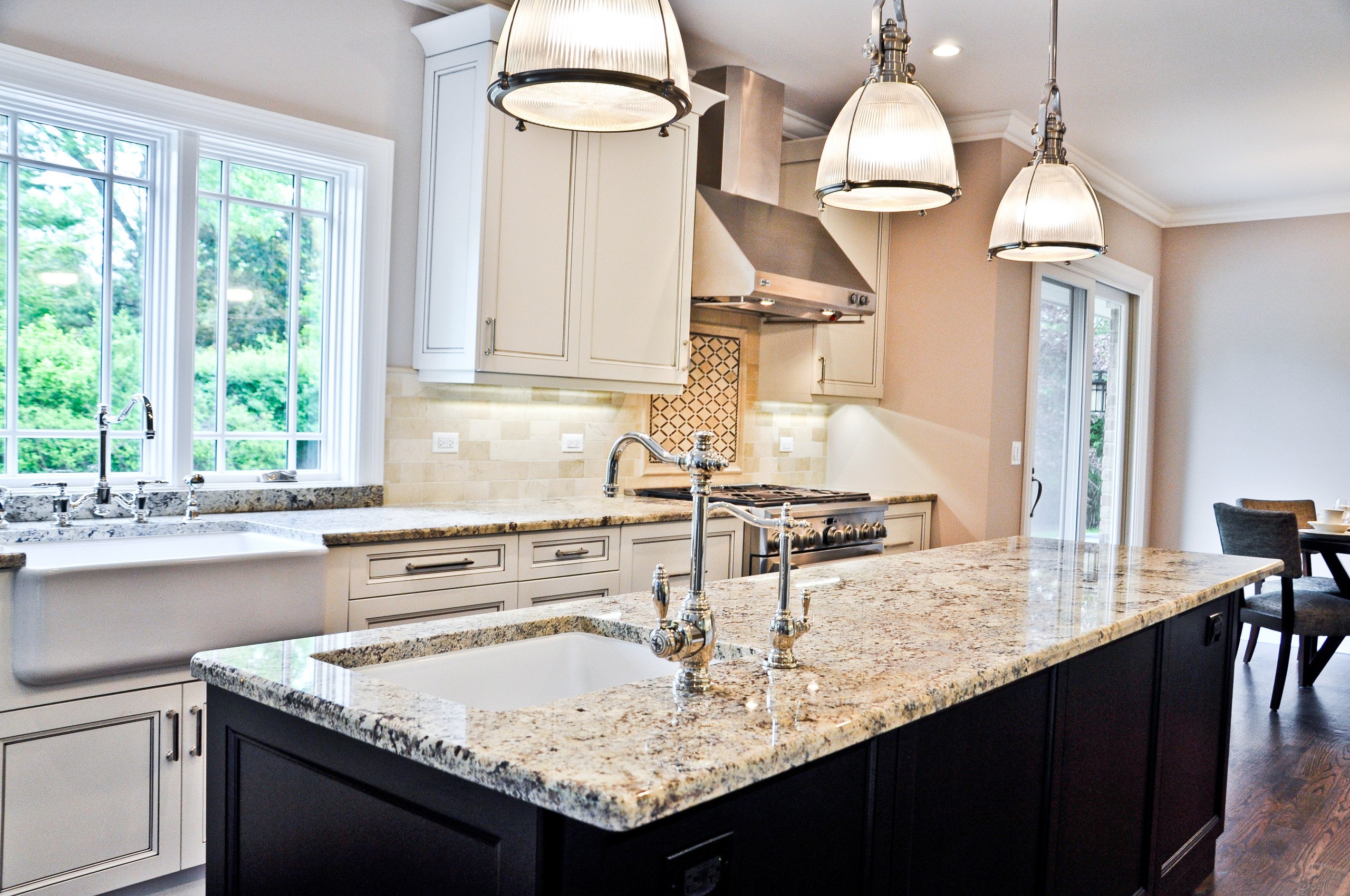 A classic two-tone color scheme gives this kitchen a lovely vintage feeling. Cream cabinets are brightened by the black pearl, which has a subtle sparkle of its own. This elegant yet cozy design goes well with antiques and ornaments of different styles.